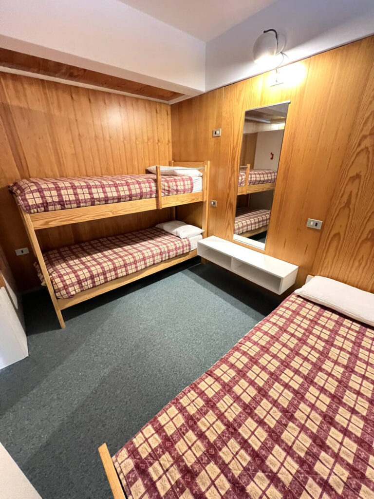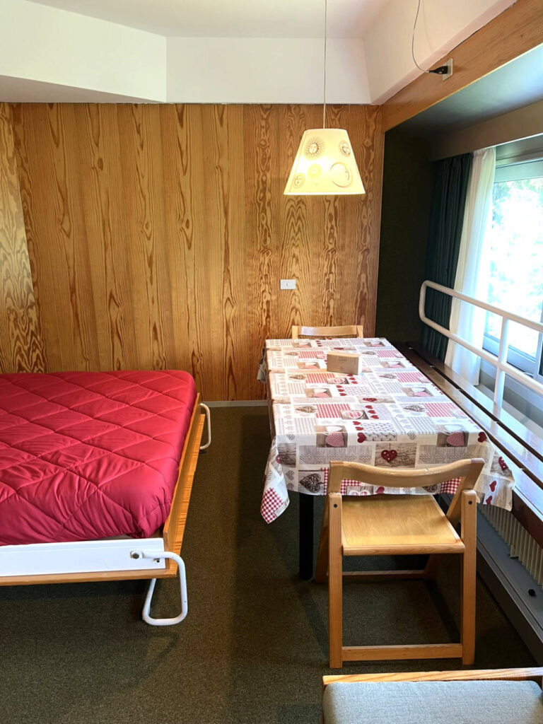 Il letto matrimoniale, richiudibile a parete per permettere di ottimizzare lo spazio, si trova nel soggiorno, mentre nella camera separata è presente un letto singolo e un letto a castello.