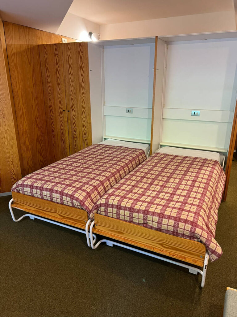 Il letto matrimoniale, richiudibile a parete per permettere di ottimizzare lo spazio, si trova nel soggiorno, in entramebe le due camere separate sono presenti letti singoli o a castello.